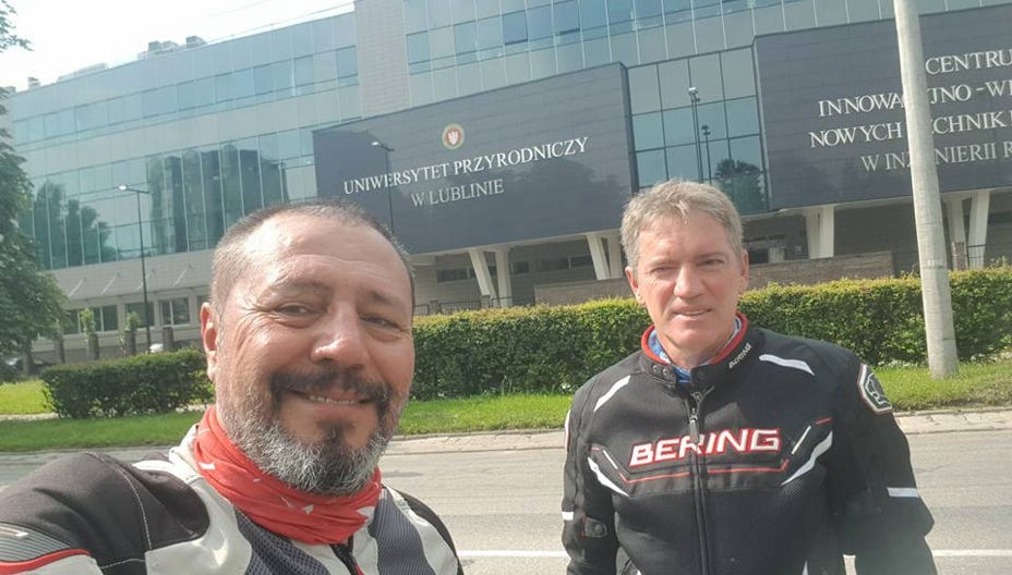 It took a long time to move from Belarusian customs to Poland, and on the way rain started and we had to wait in a long queue for Polish customs. We couldn't stay in Lublin much, we came to the hotel late at night and we left for Lithuania in the morning, and we took a picture when we met a part of Lublin University on the way.